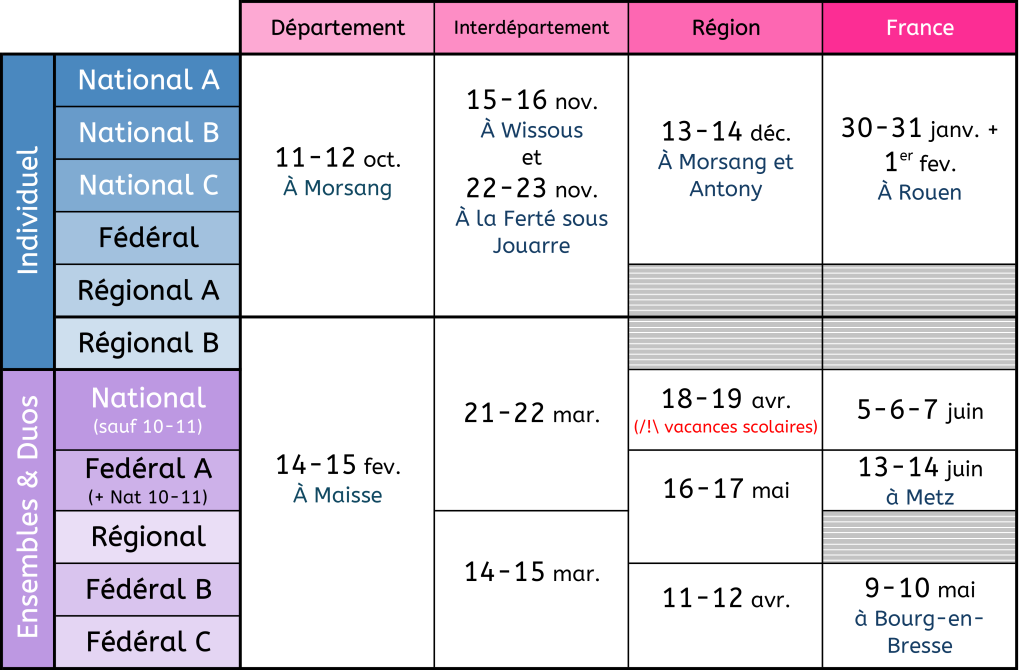 - Les catégories Régionales sont les niveaux les plus accessibles, les compétitions ont lieu d’octobre à novembre pour les individuels Régional A, et de février à mai-juin pour toutes les autres catégories. La finale de ces catégories est la région pour les ensembles et duos, et l’inter-département pour les individuels (régional A et B).